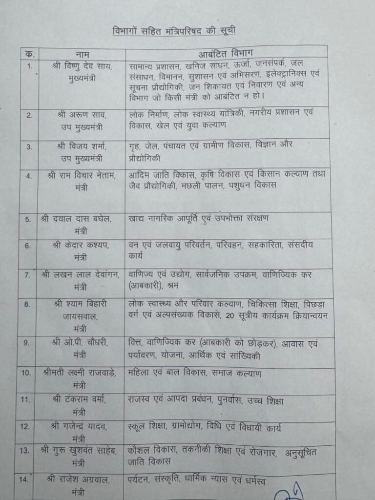 वर्तमान में मुख्यमंत्री विष्णुदेव साय के पास कई महत्वपूर्ण विभागों की जिम्मेदारी है, जिनमें सामान्य प्रशासन, खनिज साधन, ऊर्जा, जनसंपर्क, वाणिज्यिक कर (आबकारी), परिवहन, के अलावा अभी तक शिक्षा और संस्कृति से जुड़े विभाग भी हैं। मंत्रिमंडल विस्तार के बाद जल्द ही विभागों का पुनः बंटवारा किया जा सकता है।