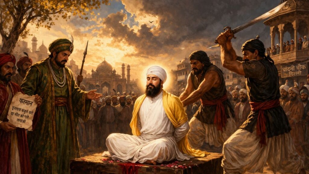 गुरु जी ने दिल्ली की ओर प्रस्थान किया। रास्ते में उन्हें गिरफ्तार कर लिया गया और सरहिंद जेल में रखा गया। दिल्ली पहुंचने पर औरंगजेब ने गुरु जी को दो विकल्प दिए – या तो इस्लाम स्वीकार कर लो, या चमत्कार दिखाओ, या फिर मौत स्वीकार करो। गुरु जी ने दोनों प्रस्ताव ठुकरा दिए। उन्होंने न तो धर्म बदला और न कोई चमत्कार दिखाया। उनके साथ तीन साहसी साथी भी थे – भाई मति दास, भाई सती दास और भाई दयाला जी। इन तीनों को क्रूर यातनाएं दी गईं। भाई मति दास को आरा (करघे की तरह) से चीरा गया, भाई सती दास को रूई में लपेटकर आग लगा दी गई, और भाई दयाला जी को उबलते पानी में डाल दिया गया। लेकिन कोई भी नहीं टूटा।