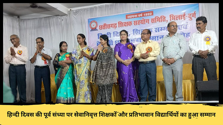 भिलाई नगर, 16 सितम्बर 2025। छत्तीसगढ़ शिक्षक सहयोग समिति भिलाई (दुर्ग) के तत्वावधान में प्रतिवर्ष की भांति इस वर्ष भी हिन्दी दिवस की पूर्व संध्या पर 13 सितम्बर को शिक्षक सम्मान समारोह का आयोजन कुर्मी भवन, सेक्टर-7, भिलाई नगर में किया गया।