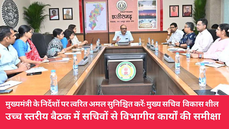 रायपुर, 14 अक्टूबर 2025/ मुख्य सचिव विकास शील ने कहा कि कलेक्टर कॉन्फ्रेंस में मुख्यमंत्री विष्णु देव साय द्वारा दिए गए निर्देशों पर त्वरित और प्रभावी अमल सुनिश्चित किया जाए। उन्होंने सभी विभागीय सचिवों को सड़क, पेयजल, बिजली, स्वास्थ्य सहित अन्य प्राथमिक क्षेत्रों के लिए ठोस एक्शन प्लान तैयार करने के निर्देश दिए। मुख्य सचिव आज मंत्रालय (महानदी भवन) में आयोजित उच्च स्तरीय बैठक में विभिन्न विभागों के भारसाधक सचिवों के साथ योजनाओं के क्रियान्वयन की प्रगति की समीक्षा कर रहे थे।
